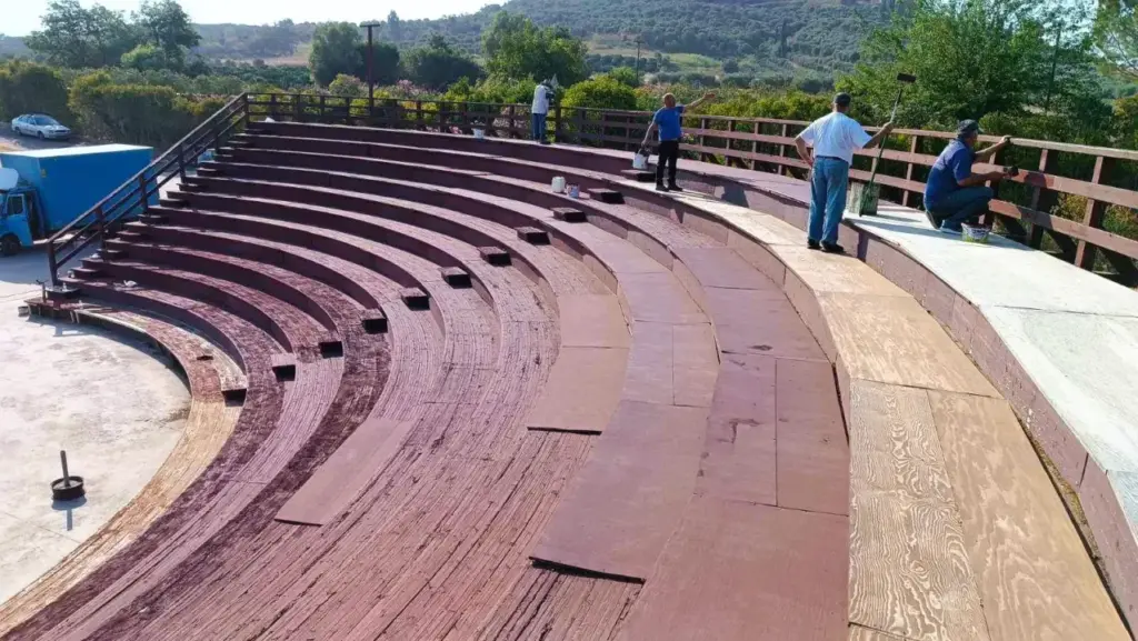 Ειδικότερα στο θέατρο εκτελούνται ξυλουργικές εργασίες και μεταλλικές υποστυλώσεις, αλλά και ελαιοχρωματισμοί. Μαζί με τα έργα, προχωρούν και οι καθαρισμοί εν όψει της πρώτης παράστασης του φεστιβάλ στο συγκεκριμένο χώρο, που έχει οριστεί για τις 23 Ιουλίου.