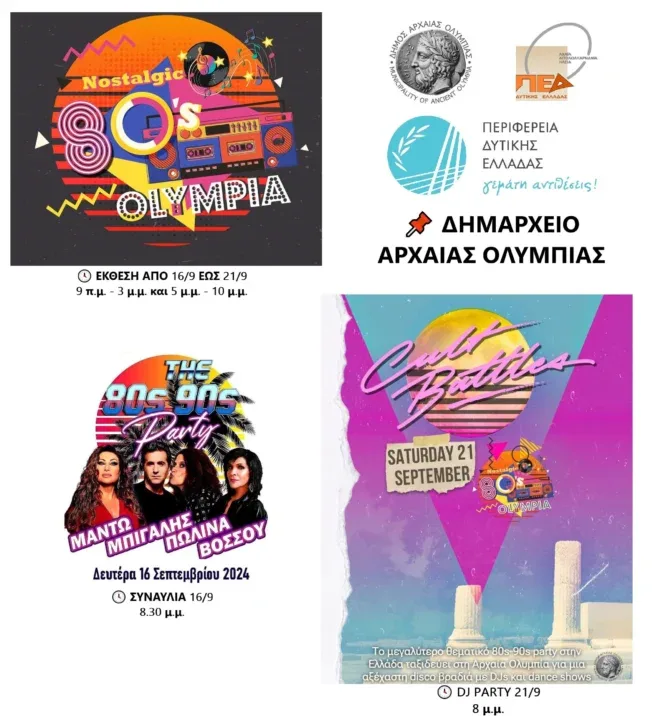 Ο Δήμος Αρχαίας Ολυμπίας πραγματοποιεί μια νοσταλγική αναβίωση των 80s, σε μια εποχή πολύ δημιουργική και αντιφατική, ανέμελη και δυναμική.