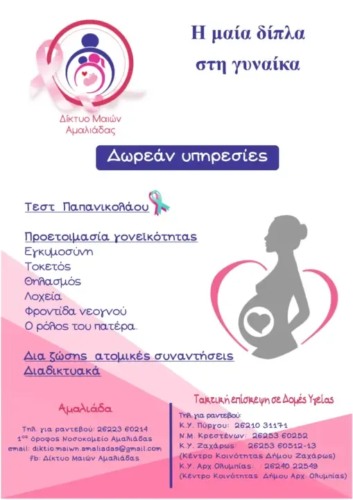 Επίσης πραγματοποιούνται δωρεάν προγράμματα προετοιμασίας γονεϊκότητας, ανώδυνου τοκετού, προαγωγής μητρικού θηλασμού και εκπαίδευσης στη φροντίδα του νεογνού, με διαδικτυακές συναντήσεις ή δια ζώσης στους ειδικά διαμορφωμένους χώρους στη Ν.Μ.Αμαλιάδας και στη Ν.Μ. Κρεστένων