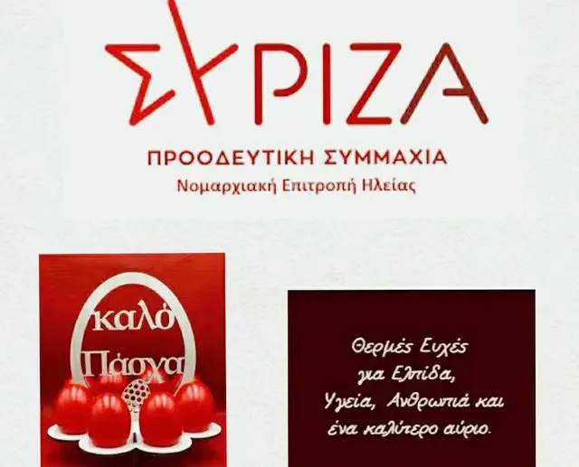 Ευχές για καλό Πάσχα απο την Νομαρχιακή Επιτροπή ΣΥΡΙΖΑ Ηλείας by Maria Petroutsa 4 Μαΐου 2024 4 Μαΐου 2024 906 Η Νομαρχιακή επίτροπή ΣΥΡΙΖΑ Ηλείας στέλνει τις θερμότερες ευχές της για καλό Πάσχα! 0 comment 0 FacebookTwitterLinkedinWhatsappViber previous post Ευχές απο τον πρώην Δήμαρχο Πύργου Παναγιώτη Αντωνακόπουλο next post Ο Δήμος Ήλιδας σε συνεργασία με το Κ.Η.Φ.Η μοίρασαν τρόφιμα την Κυριακή του Πάσχα στους άπορους συμπολίτες μας. You may also like Ο Κυριάκος Βελόπουλος έδωσε τα χέρια με τον... 26 Φεβρουαρίου 2026 Ο Δήμος βουλιάζει και τους φταίει η κριτική; 6 Φεβρουαρίου 2026 Η Αρχαία Ήλιδα πνίγεται και οι αρμόδιοι συνεχίζουν... 5 Φεβρουαρίου 2026 Πολιτιστική παρακμή με ευθύνη του Δημάρχου! 2 Φεβρουαρίου 2026 Ο συγκεντρωτικός Δήμαρχος στην πόλη που του γύρισε... 26 Ιανουαρίου 2026 ΚΟΠΗ ΠΙΤΑΣ ΣΤΟΥΣ ΠΑΙΔΙΚΟΥΣ ΣΤΑΘΜΟΥΣ 24 Ιανουαρίου 2026 Εκλέχθηκε με λόγια, αλλά κυβερνά με σιωπή και... 21 Ιανουαρίου 2026 Ολοκληρώθηκε στην Αμαλιάδα το μεγάλο συνέδριο της Ένωσης... 4 Νοεμβρίου 2024 Αυτά τα Χριστούγεννα έρχεται “Το Μαγικό Εργοστάσιο του... 4 Νοεμβρίου 2024 Συνάντηση με την Γενική Γραμματέα Υποδοχής Αιτούντων Άσυλο 4 Νοεμβρίου 2024