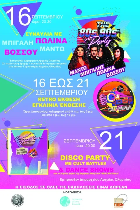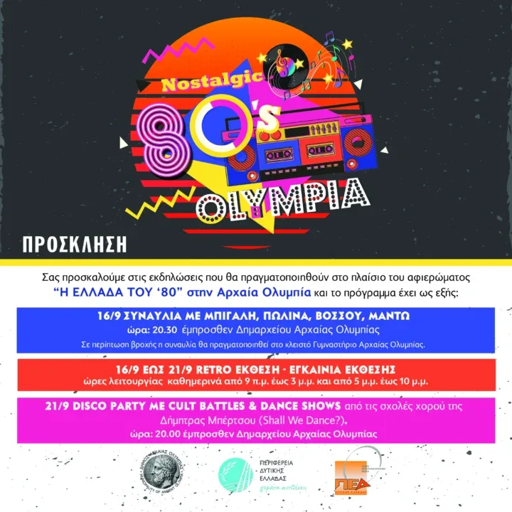 Ο Δήμος Αρχαίας Ολυμπίας πραγματοποιεί μια νοσταλγική αναβίωση των 80s, σε μια εποχή πολύ δημιουργική και αντιφατική, ανέμελη και δυναμική.