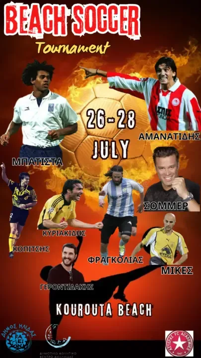 Μία εβδομάδα αργότερα, το τουρνουά Beach Soccer θα προσελκύσει στην πανέμορφη παραλία παλαίμαχους ποδοσφαιριστές με τεράστια προσφορά στο Ελληνικό Ποδόσφαιρο, όπως ο Ντανιέλ Μπατίστα, ο Γιώργος Αμανατίδης, ο Χάρης Κοπιτσής, ο Χρήστος Μικές, ο Ηλίας Κυριακίδης, αλλά και διασημότητες όπως Κώστας Σόμερ, ο Κώστας Φραγκολιάς και Γιώργος Γεροντιδάκης, οι οποίοι θα ξεδιπλώσουν το ταλέντο τους στην άμμο της Κουρούτας. Η πρώτη ημέρα -στις 26 Ιουλίου- θα συνδυαστεί και με τον ερχομό των δύο Ευρωπαϊκών κυπέλων του Ολυμπιακού, ενώ το τουρνουά συνδιοργανώνεται με τον ιστορικό Αστέρα Αμαλιάδας.