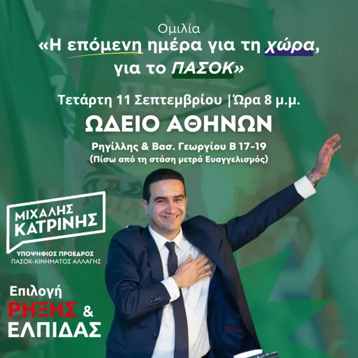 Την πρόταση του για τη Μεγάλη Παράταξη και το ΠΑΣΟΚ της επόμενης μέρας, θα παρουσιάσει ο Μιχάλης Κατρίνης, την Τετάρτη 11 Σεπτεμβρίου στις 8 το βράδυ στο Ωδείο Αθηνών.