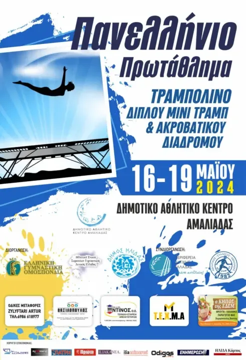 Αυτό το σαββατοκύριακο Παρασκευή 17 Σάββατο 18 Κυριακή 19 από τις 09:00 το πρωί έως 21:00 το βράδυ η Αμαλιάδα φιλοξένει το πανελλήνιο πρωτάθλημα τραμπολινο ,διπλό μίνι τραμπ και ακροβατικού διαδρόμου ,όπου θα συμμετέχουν πάνω από 350 αθλητές από όλη την Ελλάδα.