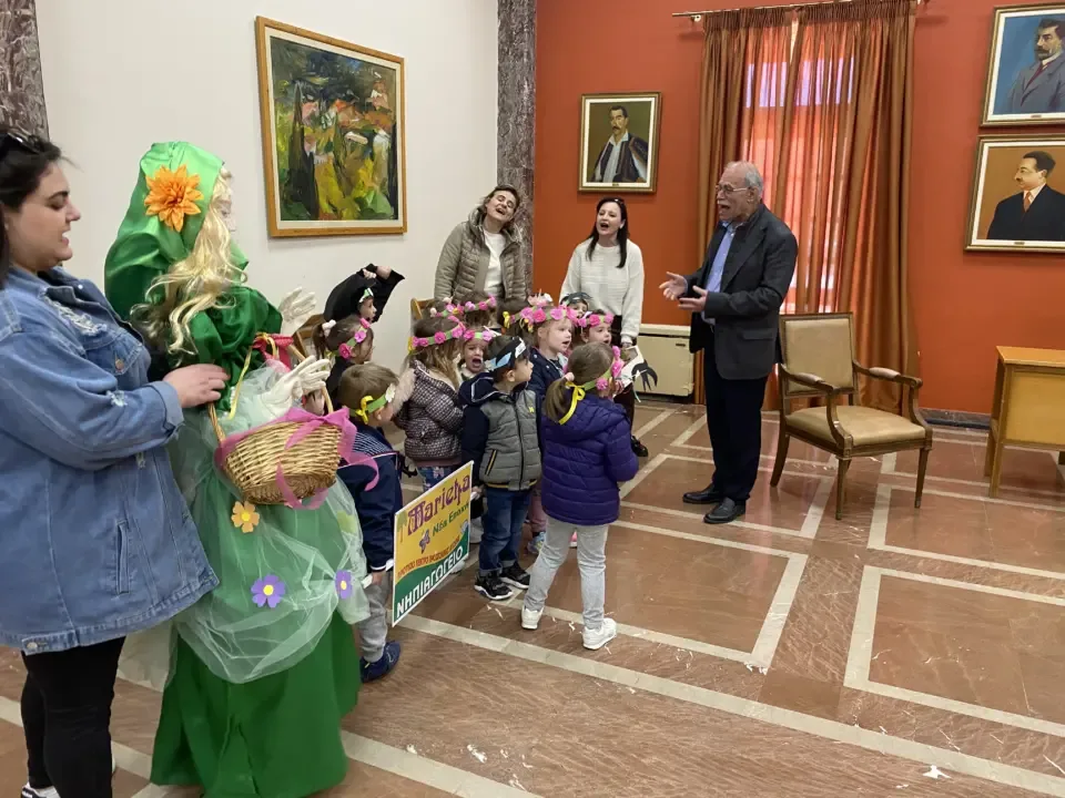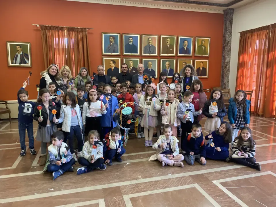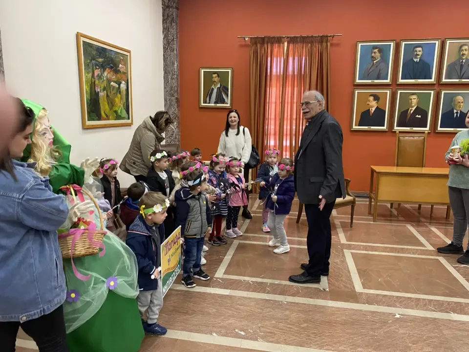 Ο Δήμαρχος Πύργου δήλωσε ιδιαίτερα ενθουσιασμένος από την επίσκεψη των παιδιών στο Δημαρχείο και τα ευχαρίστησε που σκέφτηκαν αυτό τον ξεχωριστό τρόπο για να του αναγγείλουν τον ερχομό της άνοιξης. Ως καλός οικοδεσπότης τα ξενάγησε στο Λάτσειο Δημοτικό Μέγαρο, εξήγησε στους μαθητές του Δημοτικού Σχολείου τον ρόλο του Δημοτικού Συμβουλίου και των ευθυνών που έχει ο ίδιος και τους ζήτησε όταν μεγαλώσουν να ασχοληθούν με την πόλη τους από θέσεις ευθύνης.