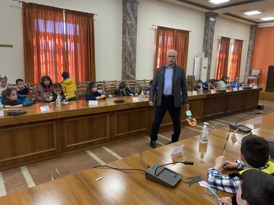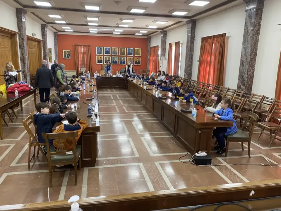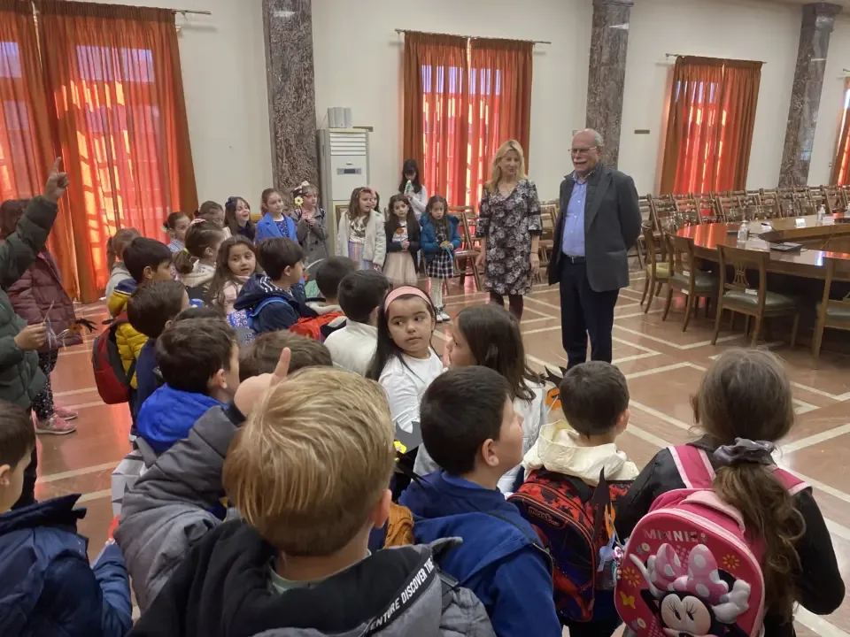 Οι μαθητές και οι εκπαιδευτικοί φεύγοντας ευχαρίστησαν τον κ. Καννή για την ολιγόωρη φιλοξενία στο Δημοτικό Μέγαρο και του ζήτησαν να συνεχίσει να φροντίζει για το καλό της πόλης.