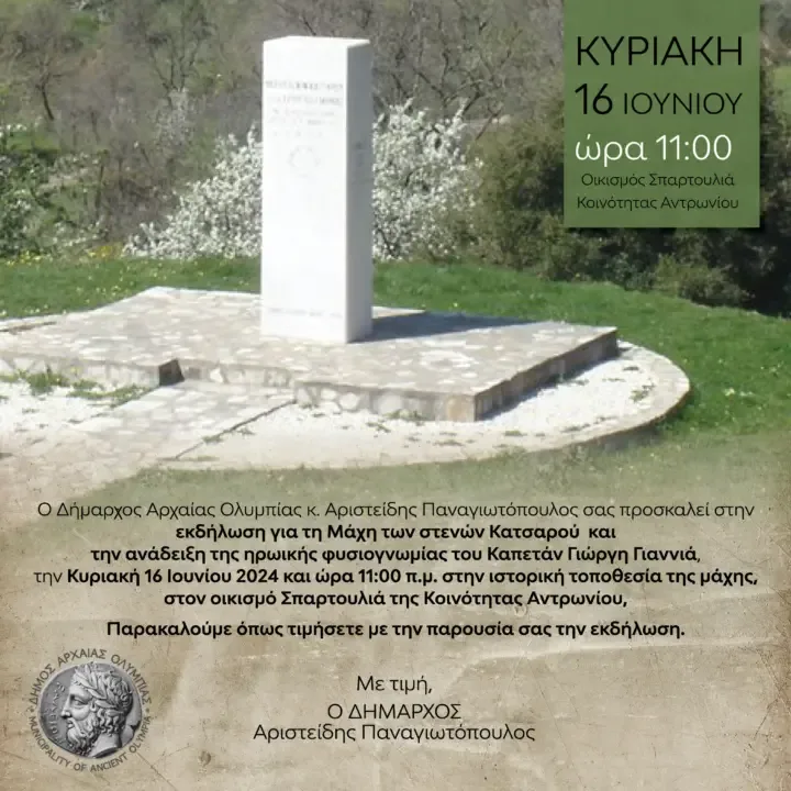 Την Κυριακή 16 Ιουνίου 2024, στις 11 π.μ., στον οικισμό Σπαρτουλιά της Κοινότητας Αντρωνίου και συγκεκριμένα στην ιστορική τοποθεσία της μάχης, θα γίνει εκδήλωση προς τιμήν του Καπετάν Γιώργη Γιαννιά και της θυσίας του, κατά την Μάχη των στενών Κατσαρού, ο οποίος έπεσε μαχόμενος κατά των τουρκαλβανών Λαλαίων, στις 27 Μαΐου 1821.